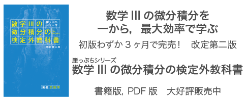 - 崖っぷちシリーズ数IIIの販売開始と正誤表の配布 書籍案内ページ にて、『崖っぷちシリーズ 数IIIの微分積分の検定外教科書』の書籍版、PDF版、正誤表を掲載しました。