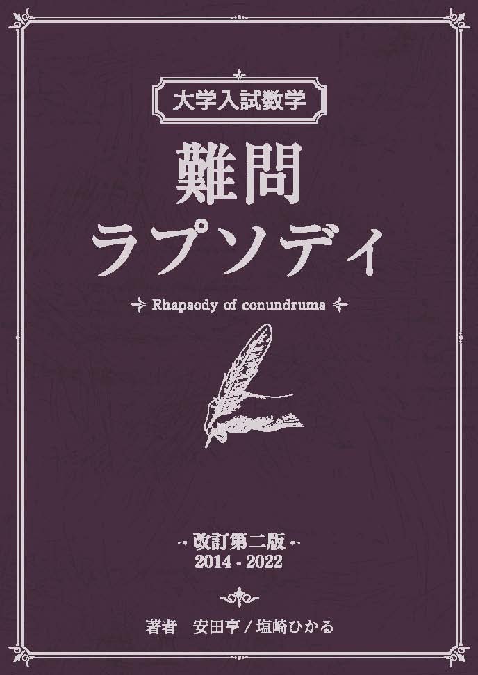 「大学入試数学難問ラプソディ」に誤りがございました。 正誤表を用意いたしましたので、下記のリンクよりPDFをダウンロードしてください。 ご購入くださった皆様にはご迷惑をお掛けしてしまい、誠に申し訳ございません。