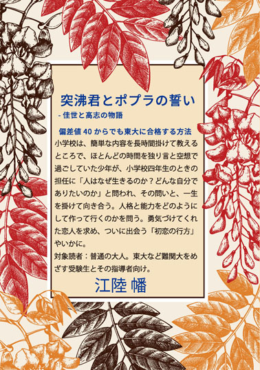 安田が小説を書きました。これは参考書ではありません。 小学校は簡単な内容を長時間掛けて教えるところで、ほとんどの時間を独り言と空想で過ごしていた少年が、小学校四年生のときの担任に「人はなぜ生きるのか?どんな自分でありたいのか」と問われ、その問いと、一生を掛けて向き合う。人格と能力をどのようにして作って行くのかを問う。勇気づけてくれた恋人を求め、ついに出会う「初恋の行方」やいかに。対象読者:一般の人、現在はあまりできないけれど、東大など難関大を志望する人、難関大志望者を指導する大人向け。